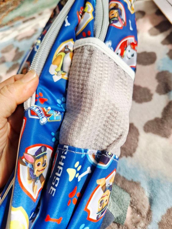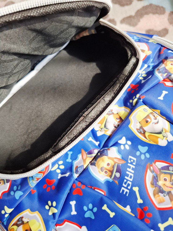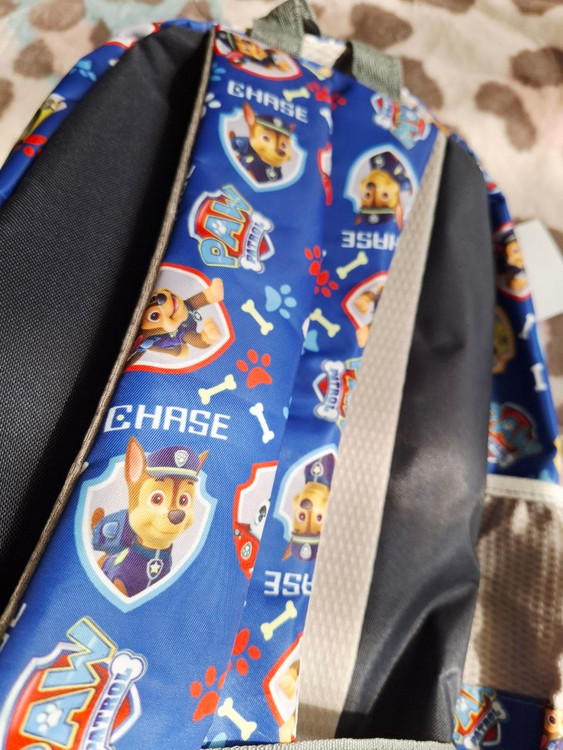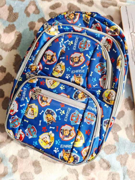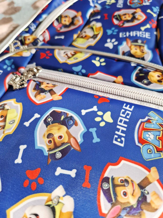 کوله طرح سگ های نگهبان رنگ زمینه آبی کاربنی دارای یک زیپ بزرگ و ۴ جیب زیپ دار روی کیف دو جیب کش دوزی بغل کیف پرجا و کاربردی مناسب سنین پیش دبستانی و دبستان موجودی ۱ عدد