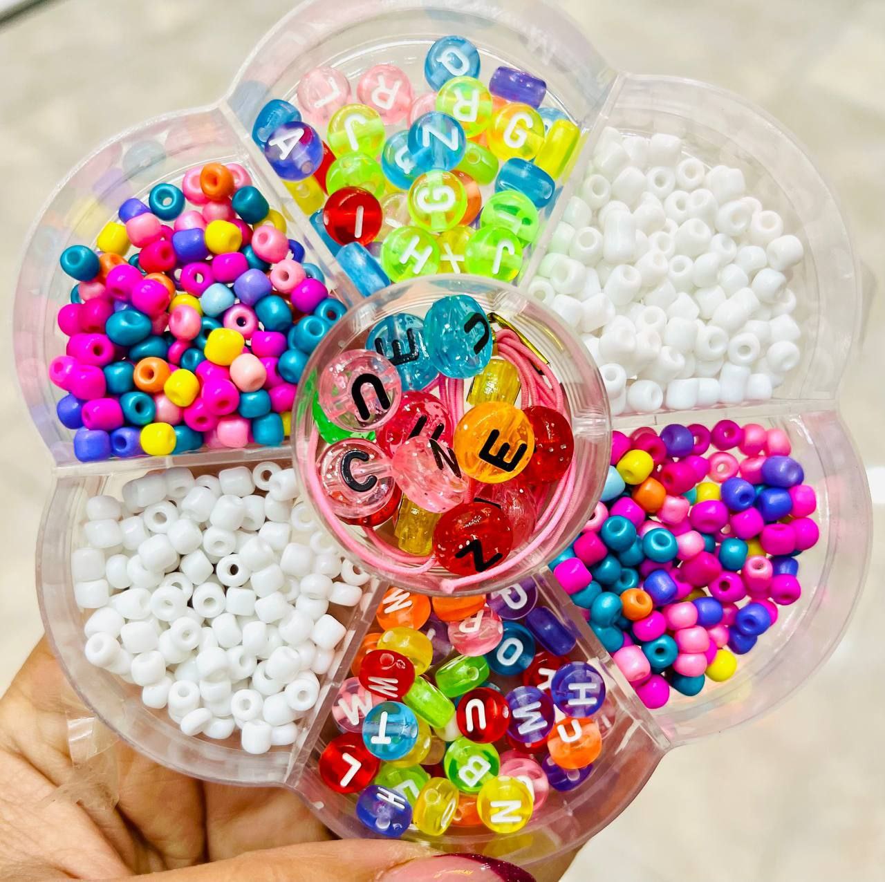 💕پک مهره های دستبندسازی 💕دارای جعبه مقسم شکل گل 💞فوق العاده کاربردی و جذاب 💕دارای مهره های حروف ریز و درشتد، مهره های گرد رنگی و کش برای ساخت دستبند 💕ابعاد جعبه 10 در 10 سانت 💕ساخت چین 💞💞💞💞💞💞💞💞
